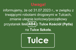 informujemy, że od 31.07.2023 r., w związku z prowadzonymi robotami drogowymi w Tulcach, zmianie ulegnie końcowy/początkowy przystanek na linii 484 z Tulce/Kościół (Pętla) na Tulce/Szkoła.