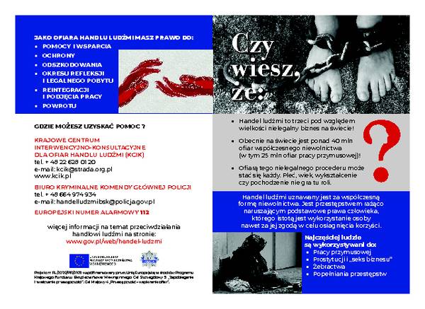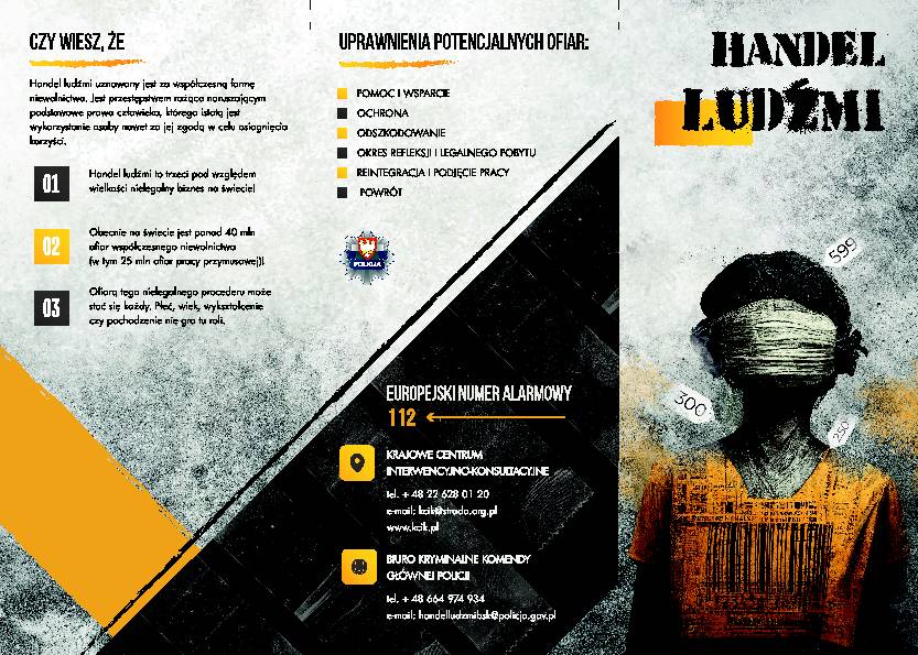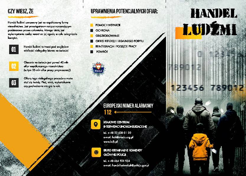 Przestępstwo handlu ludźmi jest formą współczesnego niewolnictwa, stanowiącą jedną z najcięższych zbrodni, rażąco godzącą w podstawowe prawa człowieka. Jest przestępstwem wieloczynnościowym naruszającym niezbywalne prawo każdego człowieka do wolności i godności zagwarantowanej przez liczne porozumienia międzynarodowe, a także przez Konstytucję Rzeczypospolitej Polskiej. Różnorodność form wykorzystania, transgraniczność, zróżnicowanie stosowanych przez sprawców środków przemocy, trudne, nieraz sprzeczne emocje ofiar, a także niejednolity odbiór społeczny procederu w zależności od regionu świata – wszystko to czyni z handlu ludźmi wyzwanie dla społeczności międzynarodowej, organów władzy i organów ścigania. Ponadto wieloetapowość i skomplikowanie znamion tego przestępstwa często utrudniają trafną identyfikację zjawiska handlu ludźmi, w tym identyfikację osób pokrzywdzonych tym czynem zabronionym. Informacja Strona znajduje się w archiwum. Mając świadomość tego, że każdy może stać się ofiarą handlu ludźmi, przestępstwa, które jest trzecim pod względem wielkości dochodów nielegalnym biznesem, tuż po handlu bronią i narkotykami, Biuro Prewencji wraz z Biurem Kryminalnym Komendy Głównej Policji realizują działania w ramach ogólnopolskiego projektu „Identyfikacja ofiar handlu ludźmi jako podstawa uzyskania wsparcia przez pokrzywdzonego”, którego głównym założeniem jest zwiększenie skuteczności Policji w identyfikacji ofiar handlu ludźmi. Przedsięwzięcie finansowane w ramach Funduszu Bezpieczeństwa Wewnętrznego, realizowane będzie do końca 2022 r. Celami szczegółowymi projektu są: wzrost kompetencji koordynatorów ds. handlu ludźmi w zakresie wczesnej identyfikacji ofiar i prowadzenia spotkań ze społeczeństwem oraz wytworzenie impulsu służącego wzbudzeniu świadomości zagrożeń współczesnym niewolnictwem. Beneficjentami projektu są zarówno funkcjonariusze służby kryminalnej i służby prewencyjnej, zajmujący się koordynacją zapobiegania oraz zwalczania przestępstwa handlu ludźmi na poziomie regionalnym i lokalnym, jak i osoby w wieku 16-45 lat, wyjeżdżające bądź noszące się z zamiarem wyjazdu do pracy poza granice kraju jako osoby najbardziej narażone na zjawisko handlu ludźmi, w tym zjawisko wyzysku pracowniczego. Wśród działań projektowych należy wymienić m.in.: opracowanie materiałów edukacyjnych dla funkcjonariuszy Policji, szkolenia specjalistyczne dla funkcjonariuszy Policji zajmujących się koordynacją zapobiegania oraz zwalczania przestępstwa handlu ludźmi na poziomie regionalnym i lokalnym, prowadzone na terenie całego kraju, przygotowanie spotu na temat zapobiegania handlowi ludźmi, opracowanie oraz wydruk 300 000 egzemplarzy ulotek informacyjnych, międzynarodową konferencję będącą okazją do wymiany doświadczeń i najlepszych praktyk w obszarze zapobiegania i zwalczania handlu ludźmi. Opracowane broszury informacyjno-edukacyjne dedykowane są osobom najbardziej narażonym na zjawisko handlu ludźmi, informacje tam zawarte mają za zadanie uwrażliwienie obywateli na symptomy tego zjawiska, obalenie mitów i błędnych przekonań oraz zawierają podpowiedzi, jakie są ich prawa i gdzie w sytuacji zagrożenia mogą szukać pomocy. Celem produkcji i emisji spotu jest dotarcie do jak największej grupy odbiorców w celu podniesienia świadomości osób wyjeżdżających bądź noszących się z zamiarem wyjazdu do pracy poza granice kraju, w tym młodzieży, w obszarze zagrożeń wiążących się z przestępstwem handlu ludźmi, przede wszystkim wyzyskiem pracowniczym. Podkreślić należy, że współczesnych niewolników jest więcej niż kiedykolwiek w historii, a samo zjawisko podlega bardzo dynamicznym przemianom. Mamy nadzieję, że realizowany obecnie projekt pomoże w sprawnej i skutecznej identyfikacji ofiar handlu ludźmi.