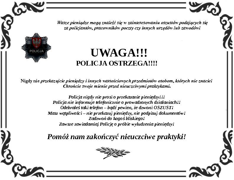 Szanowni Państwo pamiętajcie, że Policja nigdy nie będzie chciała żebyście przekazywali swoje pieniądze czy kosztowności.